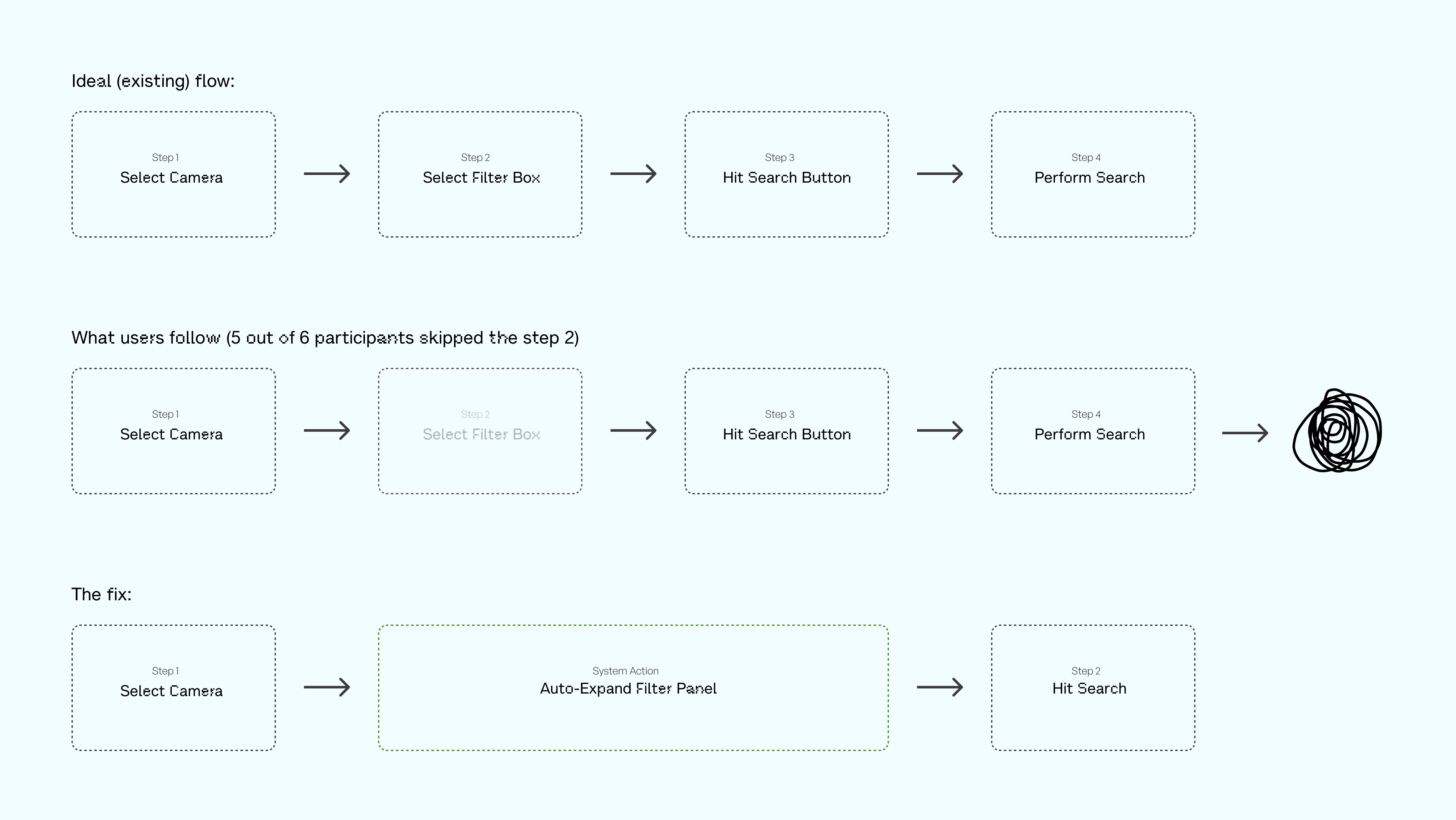 5 out of 6 operators defaulted to manual scrubbing throughout their sessions; none attempted to use the filter panel even once. When asked, "Have you tried the forensic search?" most responded, "Wait, what search?"